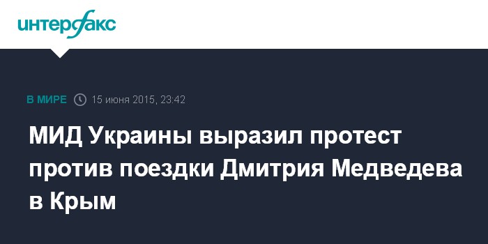 Москва. 15 июня. INTERFAX.RU - Министерство иностранных дел Украины выразило протест в связи с пребыванием в Крыму премьер-министра РФ Дмитрия Медведев, сообщает в понедельник пресс-центр МИД Украины.