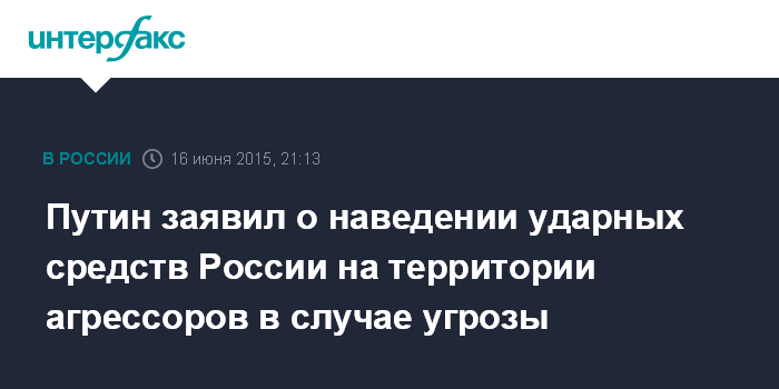 Москва. 16 июня. INTERFAX.RU - Если какие-то страны угрожают безопасности России, она будет вынуждена нацелить свои ударные средства на эти территории, заявил президент РФ Владимир Путин.