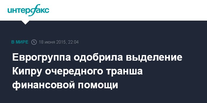 Москва. 18 июня. INTERFAX.RU - Еврогруппа отметила прогресс Кипра на пути выхода из кризиса и, в принципе, одобрила выделение ему очередного транша финансовой помощи, отмечается в коммюнике Еврогруппы, распространенном в четверг.