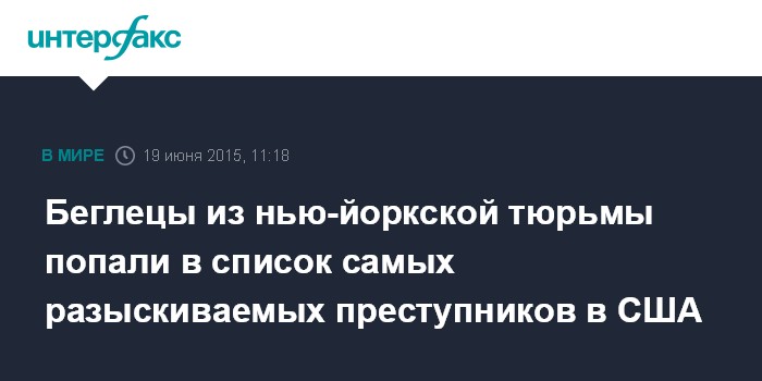 Москва. 19 июня. INTERFAX.RU - Служба судебных приставов США внесла двух беглецов из нью-йоркской тюрьмы в список самых разыскиваемых преступников страны и предлагает $50 тыс. за информацию, которая поспособствует их поимке, передает в пятницу американский телеканал CNN.