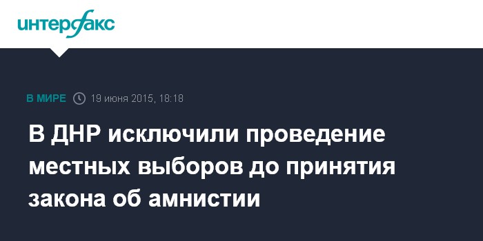 Москва. 19 июня. INTERFAX.RU - В руководстве самопровозглашенной Донецкой народной республики заявили о невозможности провести местные выборы, оговоренные минскими соглашениями, без принятия Украиной закона об амнистии.