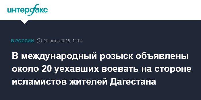 Москва. 20 июня. INTERFAX.RU - Правоохранительные органы объявили в международный розыск минимум 20 жителей Дагестана, уехавших в Сирию воевать на стороне террористических организаций "Аль-Каида" и "Исламское государство", сообщил "Интерфаксу" источник, знакомый с ситуацией.