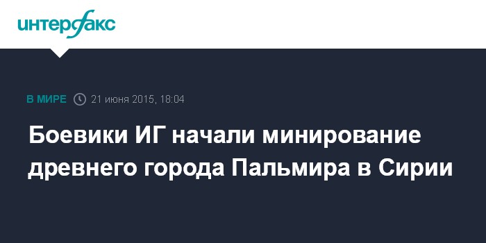 Москва. 21 июня. INTERFAX.RU - Боевики группировки "Исламское государство" начали минировать захваченную ими часть древнего города Пальмиры в Сирии, сообщил в воскресенье глава базирующегося в Лондоне Наблюдательного совета по правам человека в Сирии Рами Абдель Рахман.