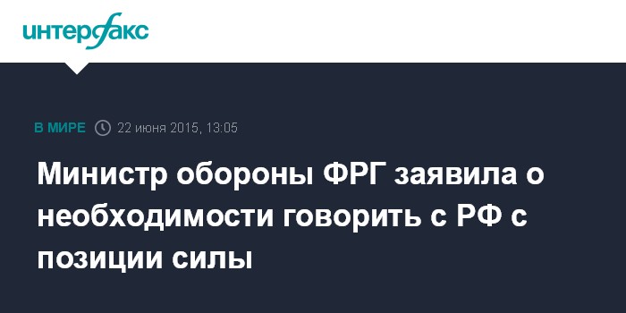 Москва. 22 июня. INTERFAX.RU - Европа хочет мирно уживаться с РФ, но с Москвой лучше вести диалог с позиции силы, считает министр обороны ФРГ Урсула фон дер Ляйен.