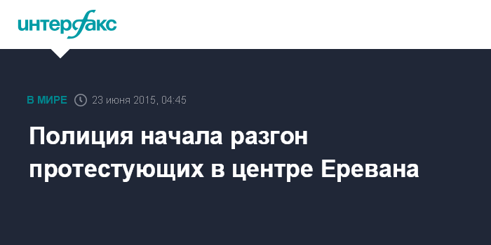 Москва. 23 июня. INTERFAX.RU - Полиция Армении начала разгон нескольких сотен демонстрантов, протестующих в центре Еревана против решения властей о повышении с 1 августа тарифа на электроэнергию, передает корреспондент "Интерфакса".