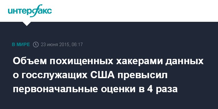 Москва. 23 июня. INTERFAX.RU - Неизвестные взломщики похитили персональные данные о 18 миллионах американских госслужащих, что превысило первоначальные оценки более чем в четыре раза, сообщил во вторник телеканал CNN со ссылкой на представителей власти, знакомых с ходом расследования.