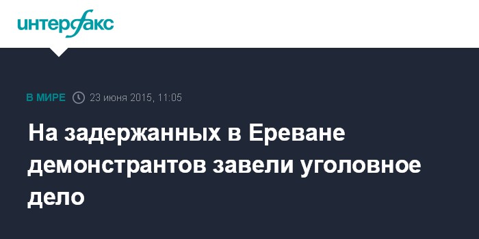 Москва. 23 июня. INTERFAX.RU - В отношении задержанных участников акции, протестовавших в центре Еревана против повышения тарифов на электроэнергию, возбуждено уголовное дело.