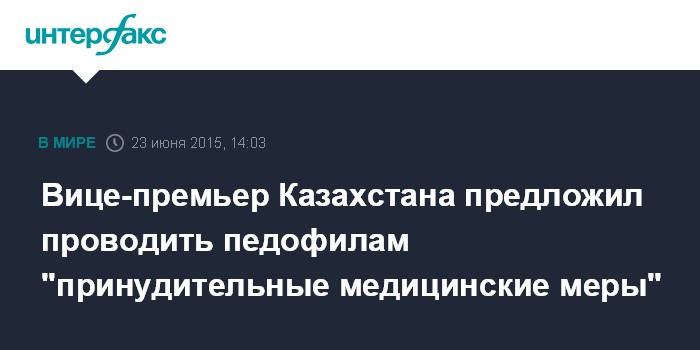 Москва. 23 июня. INTERFAX.RU - МВД Казахстана поручено подготовить предложения по введению принудительных мер медицинского характера в отношении лиц, осужденных за совершение сексуально-насильственных действий в отношении детей.