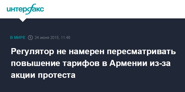 Москва. 24 июня. INTERFAX.RU - Государственная комиссия по регулированию общественных услуг (КРОУ) Армении не обсуждает возможность пересмотра принятого ранее решения о повышении тарифов на электроэнергию с 1 августа текущего года, несмотря на массовые протесты населения.
