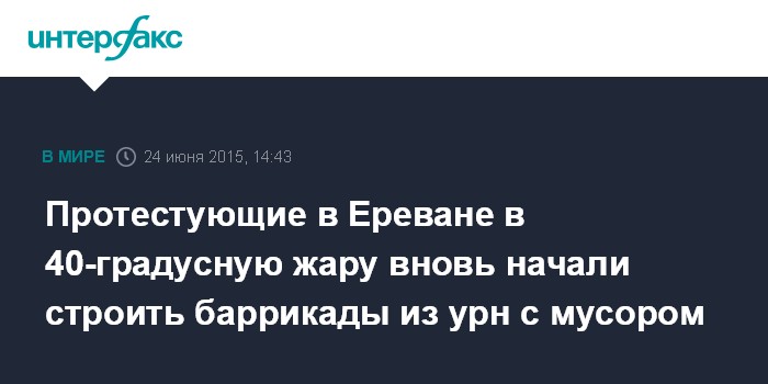 Москва. 24 июня. INTERFAX.RU - Участники акции протеста против повышения тарифов на электроэнергию принесли на проспект Баграмяна в центре Еревана новые мусорные урны, с помощью который они забаррикадировались от сил полиции.