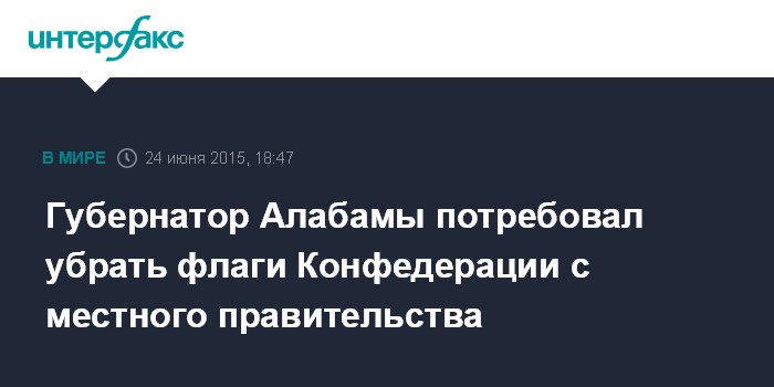 Москва. 24 июня. INTERFAX.RU - Губернатор американского штата Алабама отдал распоряжение спустить флаги Конфедерации с Капитолия - резиденции правительства штата - в столице Алабамы городе Монтгомери, сообщает в среду AP.