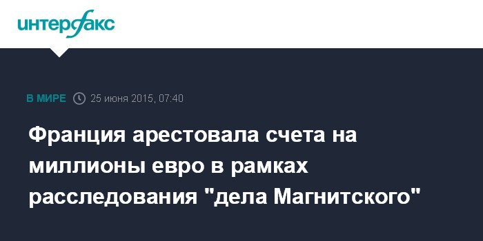 Москва. 25 июня. INTERFAX.RU - Во Франции правоохранительными органами арестованы счета на несколько миллионов евро в рамках проверки информации российского юриста Сергея Магнитского об отмывании денег, сообщили французские СМИ.