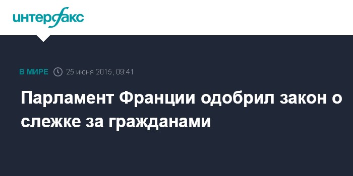 Москва. 25 июня. INTERFAX.RU - Парламент Франции в среду одобрил спорный закон о слежке за гражданами страны, несмотря на общественное возмущение вокруг заявления WikiLeaks о том, что США шпионили за тремя французскими президентами, сообщает Associated Press.