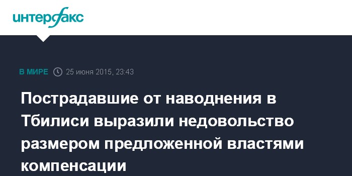 Москва. 25 июня. INTERFAX.RU - Жители улицы Сванидзе в центре Тбилиси, наиболее пострадавшие во время разрушительного наводнения, происшедшего в ночь на 14 июня в грузинской столице, недовольны предложенной государством компенсацией и создали комитет по защите своих прав.