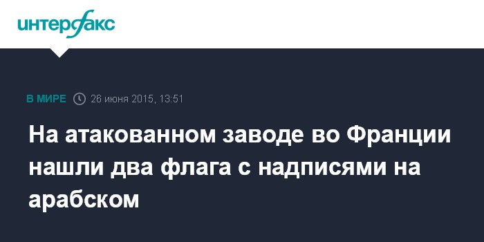 Москва. 26 июня. INTERFAX.RU - Два флага с надписями на арабском языке обнаружены в пятницу в ходе антитеррористической операции на территории завода по производству промышленных газов в департаменте Изер на юго-восток Франции, сообщает французский телеканал France 24.
