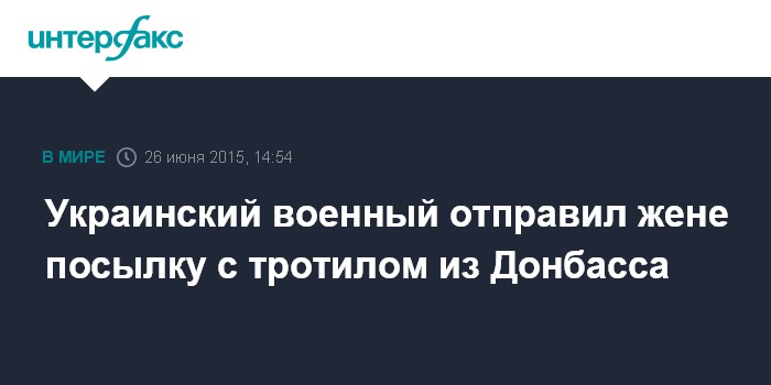 Москва. 26 июня. INTERFAX.RU - Украинский военнослужащий отправил своей жене из зоны силовой операции в Донбассе посылку, в которой находился 1 килограмм тротила и 200 грамм пороха.