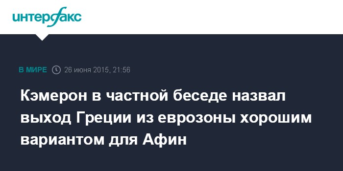 "По поводу Греции, премьер-министр спросил, разумно ли поступает Ангела Меркель, согласившись на то, чтобы вести дискуссию с Афинами (по вопросу о греческом долге - ИФ) на уровне глав правительств. Также он предположил, что, возможно, для Греции было бы лучше, если бы она покинула еврозону, так как в таком случае смогла бы навести порядок в своей экономике", - говорится в полученном Guardian документе.