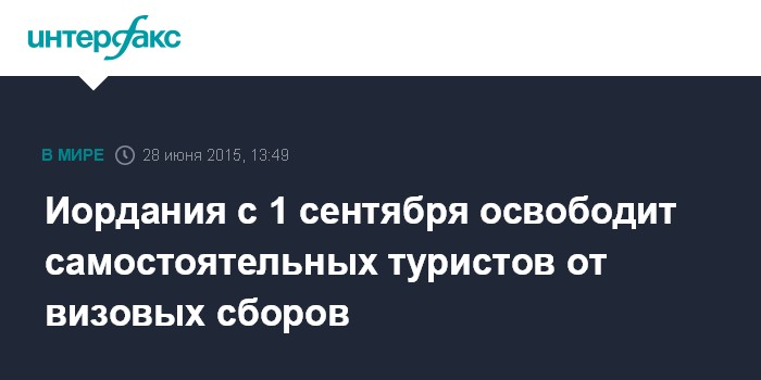 Москва. 28 июня. INTERFAX.RU - Иордания отменит визовый сбор для индивидуальных путешественников с 1 сентября 2015 года, сообщили "Интерфаксу" в министерстве туризма Иордании.