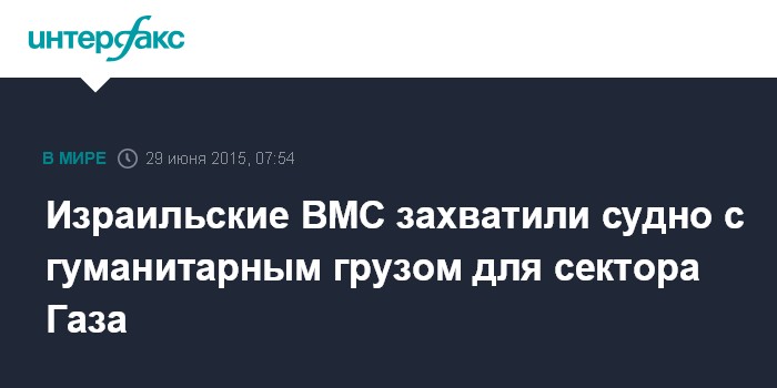 Москва. 29 июня. INTERFAX.RU - Представитель сил обороны Израиля Авичай Адраи официально объявил о задержании кораблями израильских ВМС судна "Marianne" с гуманитарным грузом и палестинскими активистами на борту, которые попытались в очередной раз прорвать блокаду сектора Газа.