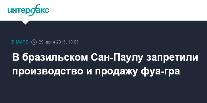 Москва. 29 июня. INTERFAX.RU - Городской совет крупнейшего в Бразилии города Сан-Паулу запретил производство и продажу фуа-гра - деликатеса, приготовляемого из печени гусей и уток, сообщает BBC.