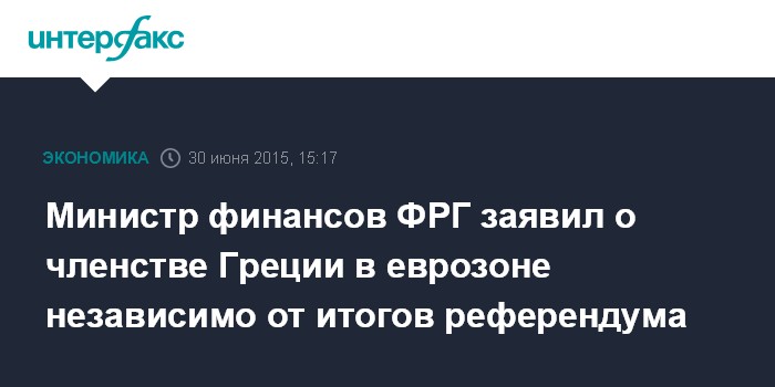 Москва. 30 июня. INTERFAX.RU - Греция останется членом еврозоны, даже если граждане страны проголосуют против предложений ее кредиторов на референдуме 5 июля, заявил германским парламентариям министр финансов ФРГ Вольфганг Шойбле.