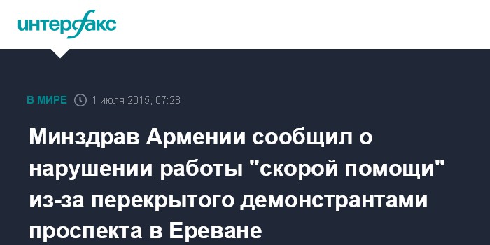 Москва. 1 июля. INTERFAX.RU - Министерство здравоохранения Армении призывает перекрывших проспект Баграмяна в центре Еревана демонстрантов не нарушать работу службы скорой медицинской помощи.