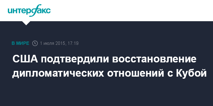 Москва. 1 июля. INTERFAX.RU - США подтверждают решение возобновить дипотношения с Кубой и открыть посольства 20 июля, сообщил в среду МИД Кубы со ссылкой на послание президента США Барака Обамы, направленное главе Госсовета Кубы Раулю Кастро.