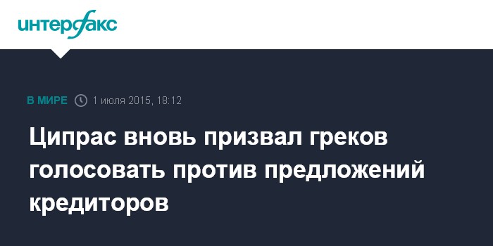 Москва. 1 июля. INTERFAX.RU - Премьер-министр Греции Алексис Ципрас в среду снова призвал сограждан высказаться против предложений кредиторов на предстоящем референдуме 5 июля.