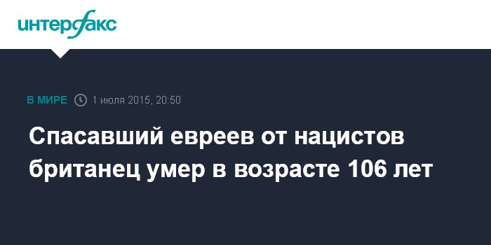 Москва. 1 июля. INTERFAX.RU - Сэр Николас Уинтон, который помог спасти от нацистских концлагерей 669 детей, скончался в Великобритании в возрасте 106 лет, сообщает "Би-би-си".