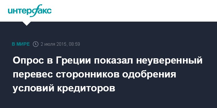 Москва. 2 июля. INTERFAX.RU - У греческих избирателей нет единого мнения по вопросу об одобрении условий соглашения с кредиторами, лишь с минимальным перевесом греки склоняются к тому, чтобы сказать на предстоящем в воскресенье референдуме "да", сообщает агентство Bloomberg.