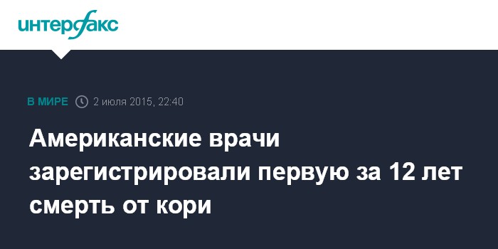 Москва. 2 июля. INTERFAX.RU - Жительница США скончалась от кори, что стало первым подобным случаем в стране за 12 лет, сообщили в четверг западные СМИ.