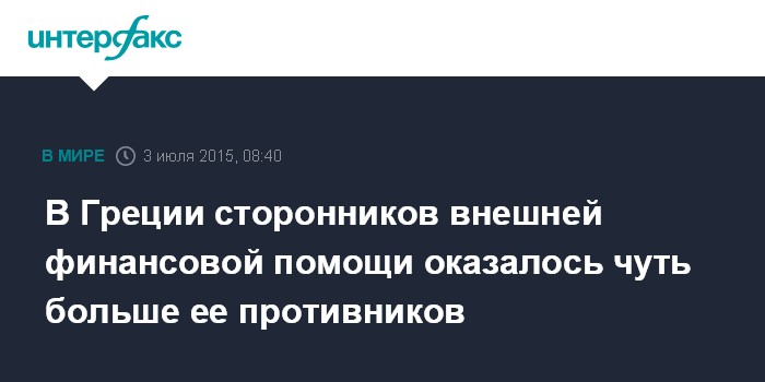 Москва. 3 июля. INTERFAX.RU - На предстоящем в воскресенье референдуме незначительное большинство граждан Греции, судя по опросу общественного мнения, намерено согласиться с предложениями кредиторов из ЕС и МВФ о дальнейшем сокращении расходов в обмен на внешнее финансирование страны.