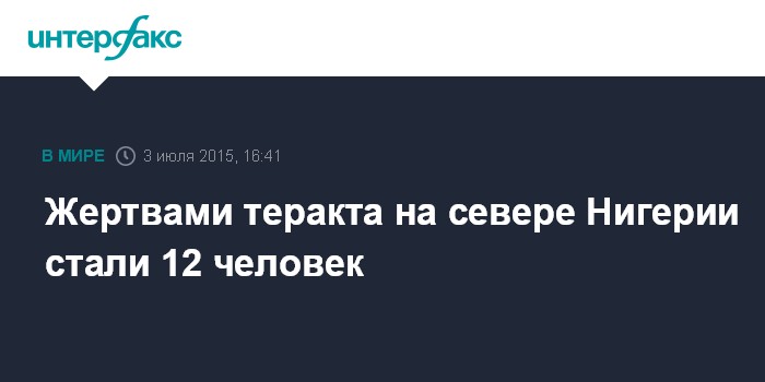 Москва. 3 июля. INTERFAX.RU - Не менее 12 человек погибли в результате взрыва, устроенного террористкой-смертницей в нигерийской деревне Малари на северо-востоке страны, сообщает в пятницу сайт ливанской газеты The Daily Star.