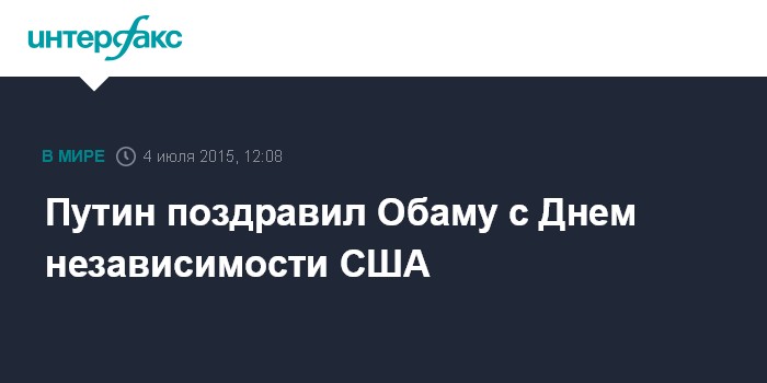 Москва. 4 июля. INTERFAX.RU - Президент России Владимир Путин поздравил президента Соединенных Штатов Барака Обаму с национальным праздником - Днем независимости, сообщает пресс-служба Кремля.