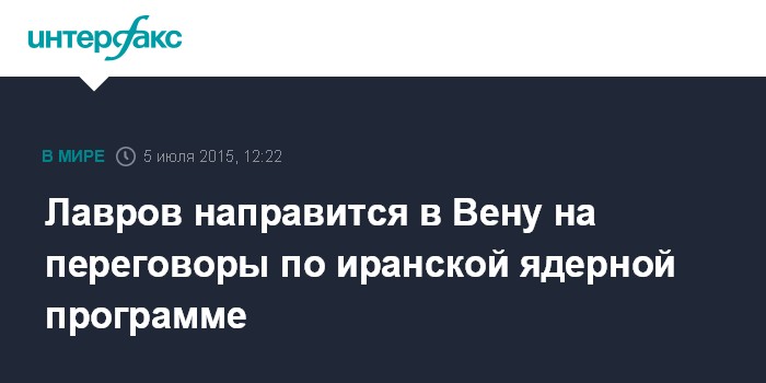 Москва. 5 июля. INTERFAX.RU - Министр иностранных дел России Сергей Лавров позднее в воскресенье направится в Вену для продолжения переговоров по иранской ядерной программе, сообщает иранский сайт Nuclear Talks, посвященный переговорам по ИЯП.