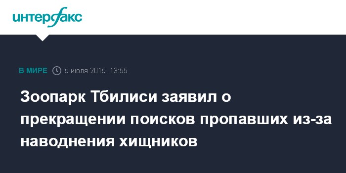 Москва. 5 июля. INTERFAX.RU - Зоопарк Тбилиси прекратил поиски хищников, пропавших во время июньского наводнения, после того, как близ зоологического сада был найден мертвый тигр.