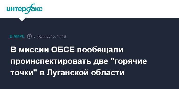 Москва. 5 июля. INTERFAX.RU - Замглавы специальной мониторинговой миссии ОБСЕ Александр Хуг обещает предпринять усилия для разрешения ситуации в "горячих точках" Луганской области.