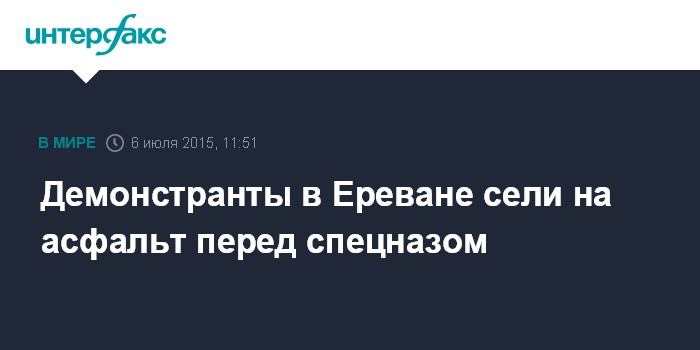 Москва. 6 июля. INTERFAX.RU - Протестующие против повышения энерготарифов демонстранты на проспекте Баграмяна в Ереване уселись на асфальт перед выстроенными в ряд силами спецназа, передает корреспондент "Интерфакса".