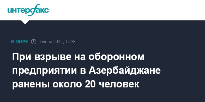 Москва. 6 июля. INTERFAX.RU - В городе Ширван в центральном регионе Азербайджана произошел взрыв на заводе телемеханики, принадлежащем Министерству оборонной промышленности (МОП) страны. Пострадали около двух десятков человек.