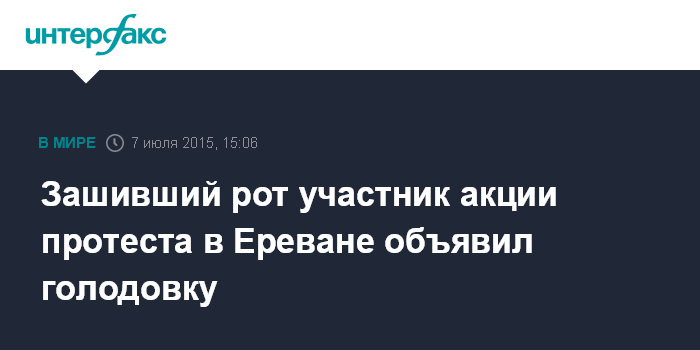 Москва. 7 июля. INTERFAX.RU - Участник акций в Ереване Ованнес Карапетян, зашивший себе рот в знак протеста против подорожания электроэнергии, днем во вторник объявил голодовку.