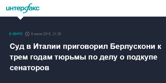Москва. 8 июля. INTERFAX.RU - Суд Неаполя приговорил экс-премьера Италии Сильвио Берлускони к трем годам тюрьмы, признав его виновным в подкупе сенаторов, сообщает в среду итальянское телевидение.
