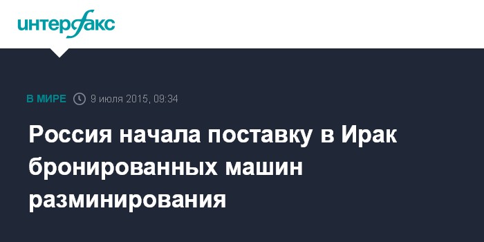 Москва. 9 июля. INTERFAX.RU - Россия поставит в Ирак партию современных бронированных машин разминирования, сообщает иранское информационное агентство Fars со ссылкой на высокопоставленного иракского представителя.