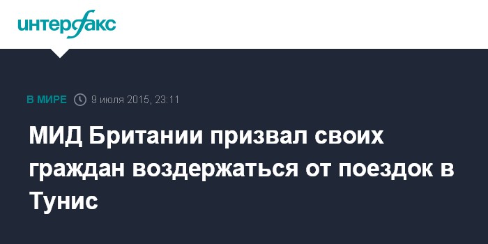 Москва. 9 июля. INTERFAX.RU - МИД Британии призывает своих соотечественников воздержаться от поездок в Тунис, а тем, кто находится в этой североафриканской стране, покинуть ее из-за возможного повторения террористических актов, сообщает в четверг агентство АП.