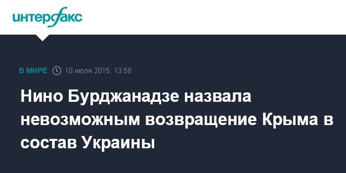 Москва. 10 июля. INTERFAX.RU - Экс-спикер парламента Грузии, ныне один из лидеров оппозиции Нино Бурджанадзе не видит ни малейшей вероятности того, что Крым когда-либо станет частью Украины.