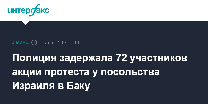 Москва. 10 июля. INTERFAX.RU - Правоохранительные органы Азербайджана задержали 72 членов Исламской партии Азербайджана (ИПА), принявших участие в несанкционированной акции протеста по случая дня "Аль-Кудс" в пятницу перед посольством Израиля в Баку.