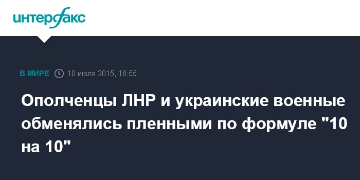 Москва. 10 июля. INTERFAX.RU - Обмен пленными по формуле "10 на 10" между ополченцами самопровозглашенной Луганской Народной Республики и Вооруженными силами Украины состоялся в пятницу под городом Счастье, сообщает ЛуганскИнформЦентр.