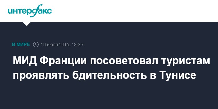 Москва. 10 июля. INTERFAX.RU - МИД Франции заявил в пятницу, что не планирует следовать примеру Великобритании, которая после бойни на пляже в июне в Тунисе предостерегла своих подданных от поездок на выходные дни в эту страну.