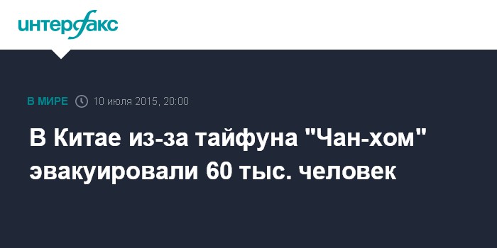 Москва. 10 июля. INTERFAX.RU - Китайские власти эвакуировали около 60 тыс. человек с юго-востока страны из-за тайфуна "Чан-хом", сообщает в пятницу американский телеканал CBS.
