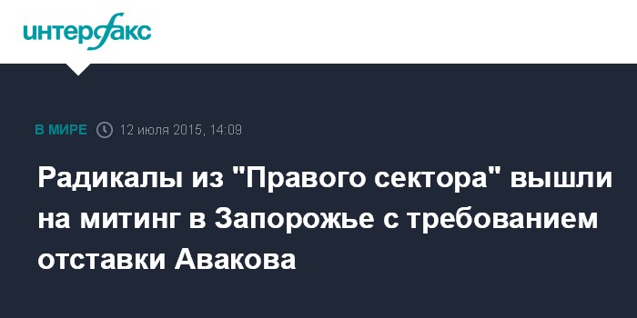 Москва. 12 июля. INTERFAX.RU - Под стенами Запорожской областной госадминистрации активисты запрещенной в России организации "Правый сектор" требуют открытого расследования событий в Мукачево и отставки главы МВД Украины Арсена Авакова.