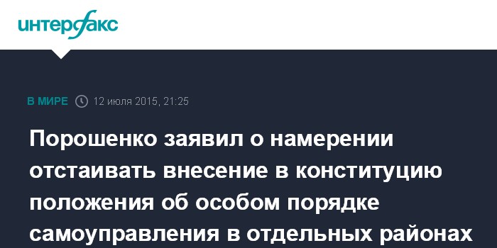 Москва. 12 июля. INTERFAX.RU - Президент Украины Петр Порошенко уверен, что включение в текст Конституции государства переходного положения об особом порядке самоуправления в отдельных районах Донецкой и Луганской областей не несет угрозы суверенитету страны.